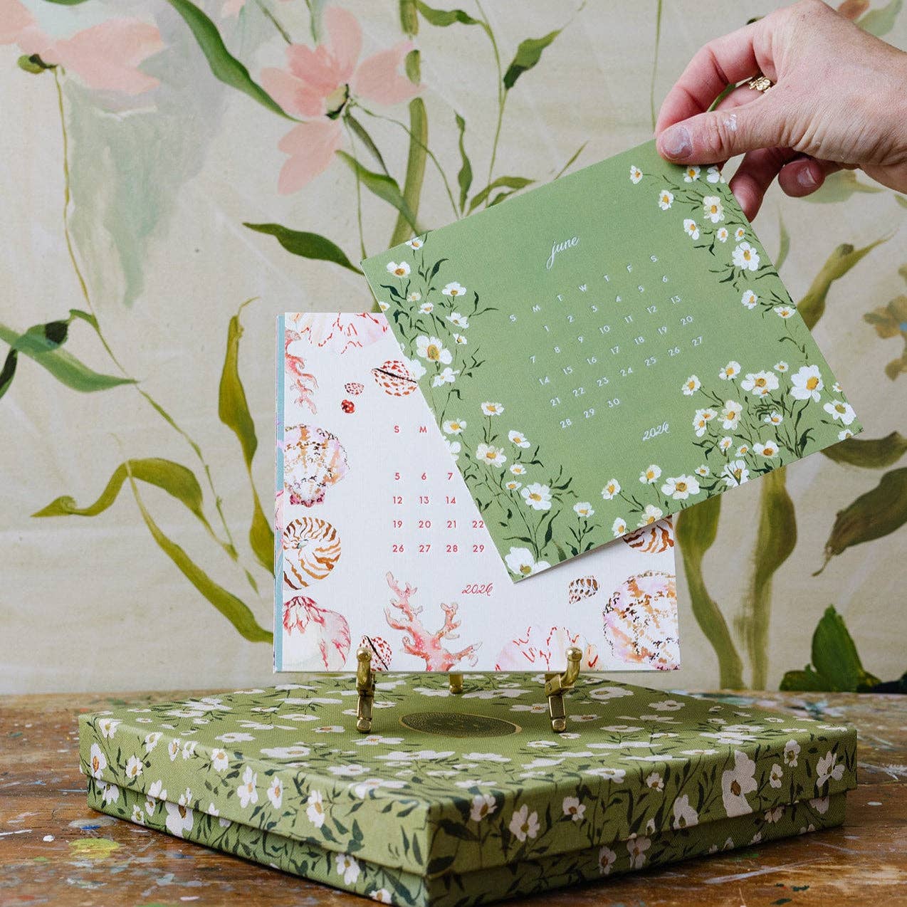 2026 Calendar with twelve watercolor designs and letter-pressed numerals on 6" square cards, nestled in a collectible linen box.