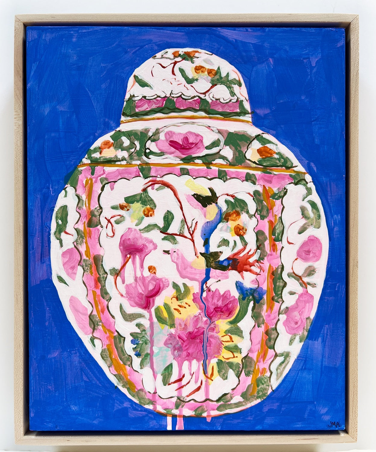 Acrylics, vinyl paint, and graphite on wooden panel in natural maple float frame